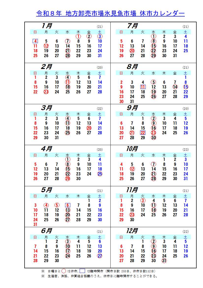 2026年休市カレンダー(PDF)